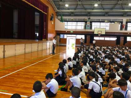8月26日(月)、本日は2学期の始まりで始業式が行われました。始業式では、学校長から夏休みを振り返るとともに、2学期に行われる多く行事、しっかりがんばることが大切であると話がありました。生活指導の先生からも、日々の生活を規則正しいものに戻していくことなどの話がありました。そして、最後に校歌をみんなで歌い教室に戻りました。