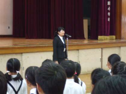10月9日(木)、児童集会に先立ち、教育実習生からご挨拶をいただきました。6人で始まった教育実習生もとうとう最後の一人となりました。来週からまた、大学に戻って勉強をされるようです。メッセージの中にもありました。「皆さんも、勉強を頑張ってください」と励ましの言葉をいただきました。