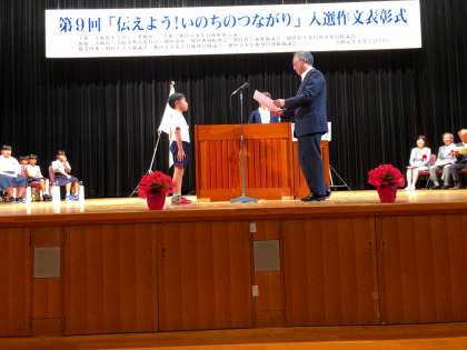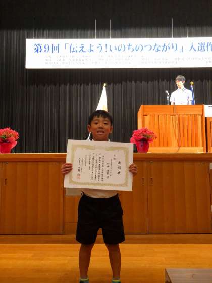 9月7日(土)に旭区民大ホールで「第9回 伝えよう!いのちのつながり」家族の絆 入選作文の表彰式が行われました。3465名の応募の中から、本校の2年生児童が、佳作として入選し、お母さんへの感謝の気持ちを素直に表現したいい作文を、観客の前で堂々と朗読しました。