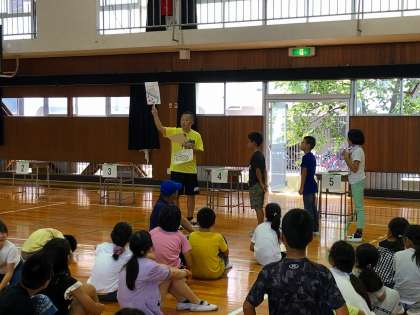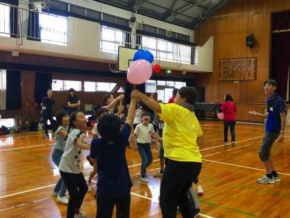 来年の林間学習の準備も兼ねて4年生を対象とした校庭キャンプが7日(土)に行われました。開会式で、お世話になる班のリーダーさんと自己紹介ゲームをして、ゲーム大会です。クイズやゲームでの結果で、昼食のカレーライスの具材(カツ・ミートボール・ウィンナー)を選ぶ権利を得ることができます。2つの風船を何秒落とさずにつけるかというゲームや、学年の先生からのクイズに挑戦しました。