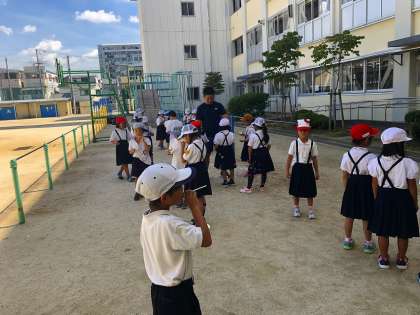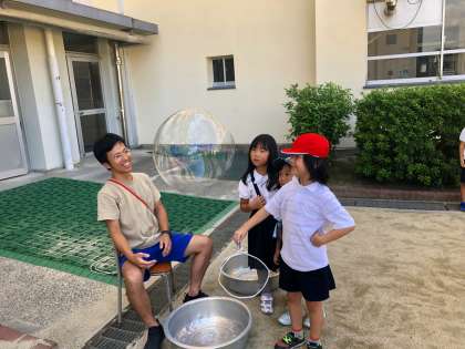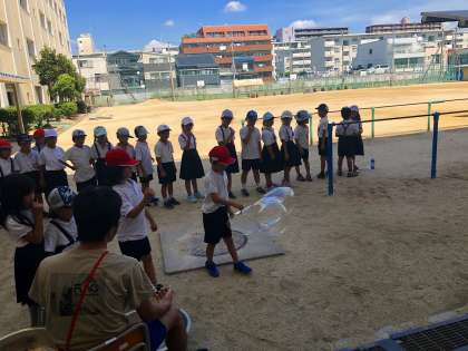 運動場にふと目をやれば、1年生がシャボン玉を作っていました。ハンガーに糸を巻いて作った特製のシャボン玉製造機で、顔よりも大きなシャボン玉を作っていました。