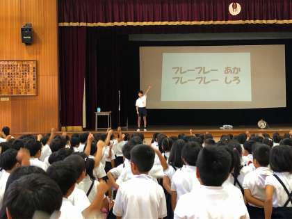 9月12日(木)の全校児童集会は、運動会の歌の練習をしました。赤白に分かれてエールを送る部分では特に大きな声が出ていました。