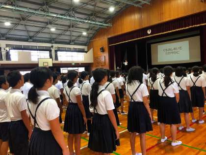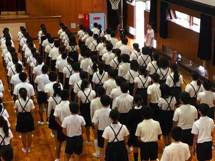 全校集会でいつも感じるのは、6年生の態度の良さです。この日も一番に講堂に来て、静かに他の学年を待っていました。静かに並んでいる6年生を見て、後から来る他学年も同じようにできていました。