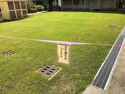 これまで、青々としていた中庭の芝生ですが、これから寒い季節を迎え徐々に枯れてきます。その代わりに冬に強い「冬芝」の種を先週末に蒔きました。週明けには、発芽してより濃い緑の冬芝が生えてきました。