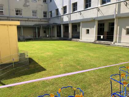 しばらくは養生期間として、中庭は入れませんが生えそろったころには、真冬でもきれいな芝生となります。