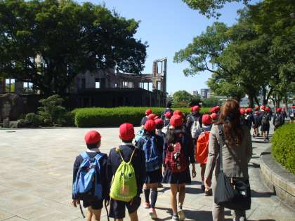 広電(路面電車)に乗り、20分ほどで、広島記念公園に到着しました。公園に入っていきなり、目の前に「原爆ドーム」がありました。