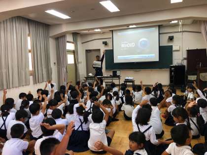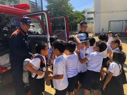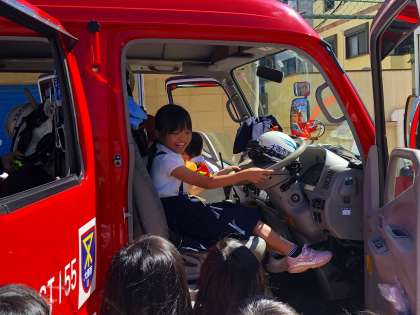 旭消防署の方々による防災体験教室がありました。1・2年生はビデオを見てクイズをした後、本物の2台の消防車について説明を受け、消火のための装備をつけさせてもらったり、消防車に乗せてもらう体験をしました。
