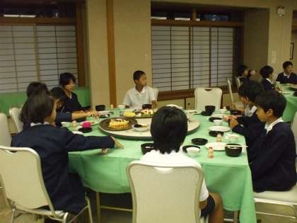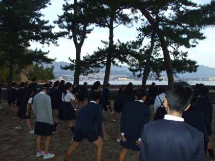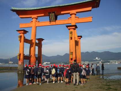 10月16日(木)の朝は、気温11度。とても寒く感じました。体操の後、前日の夕食と同じテーブルで朝食をとりました。そして、もう一つの世界遺産である厳島神社に向かいます。画像は、神社に入る前に、潮が引いていたので、みんなで鳥居まで歩いていきました。