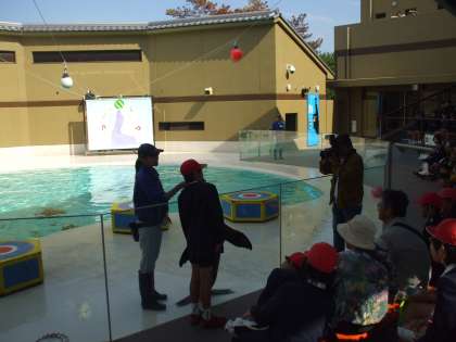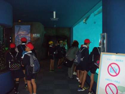 水族館では、楽しい魚がいっぱい。活動班、なかなか前に進みませんでした。10時30分からは、アシカショーがありました。2組の男の子がショーに参加しました。観客席の最上段から投げた輪っかに見事、アシカ君が頭を通しました。最後、彼はアシカ君から感謝のキスをしてもらいました。