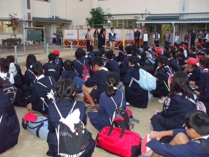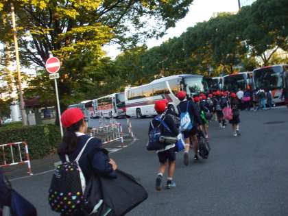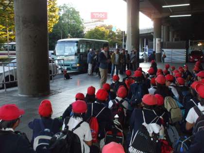 添乗員の高尾さん、写真屋の岡本さんとは、新大阪駅でお別れです。二日間ありがとうございました。迎えのバスもすでに到着しており、一路、高殿小学校へ。旭グランド北側には、保護者の方、他学年の先生が多数、出迎えてくれました。6年生のみなさん、二日間、お疲れ様でした。