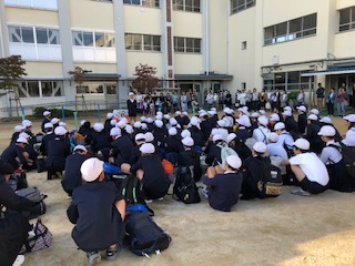 修学旅行が始まりました。空は晴天、運動場で出発式をしました。