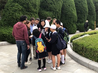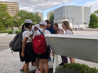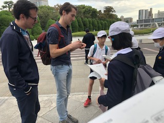 資料館の見学の後は、公園を訪れている外国の方に話しかけて、ピースメッセージを書いていただく活動をしました。