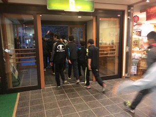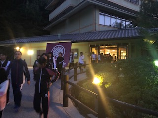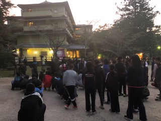 宿に着いて、まずは避難訓練です。避難経路をしっかり確認して、宿舎前に集合です。