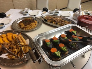 待ちに待った夕食です。本日のメニューは、ミートスパゲティ・唐揚げ・エビフライ・フライドポテト・グラタン・ハンバーグ、と子どもの好きなものオンパレードで、そこに広島焼きと大人には、ややオイリーなメニューです。