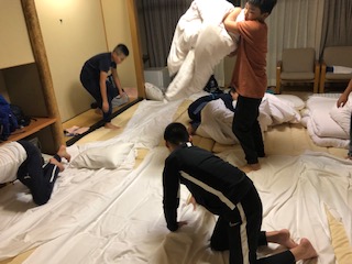 10時の消灯を前に、自分たちが寝る布団を敷いています。掛け布団と敷布団の区別はつけてくださいね。