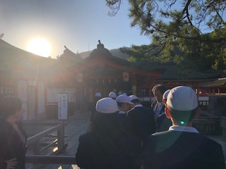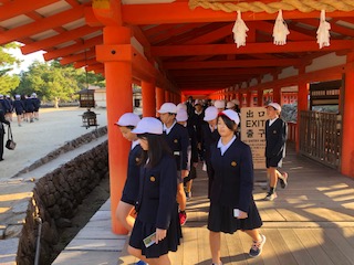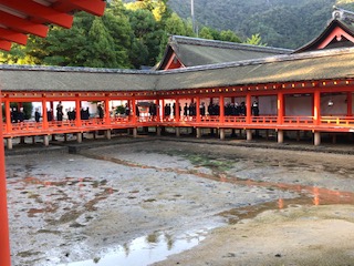 厳島神社の中にも、入りました。曲がりくねった回廊を歩くと身が引き締まる感じです。