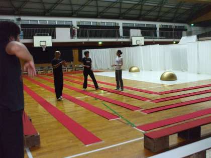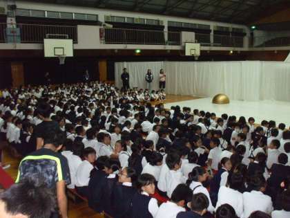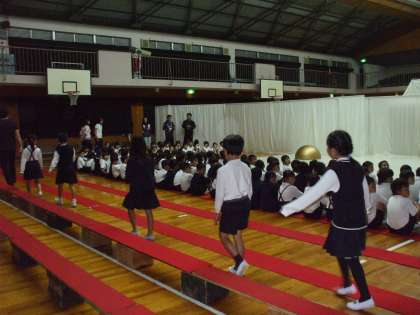 10月22日(水)、10時30分から講堂で劇団KIOさんによる劇を6学年全員で鑑賞しました。行動の舞台側フロアーにステージが作られていました。子どもたちが入場するまでの練習風景です。桟敷席が作られ、いよいよ劇が始まります。