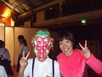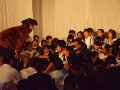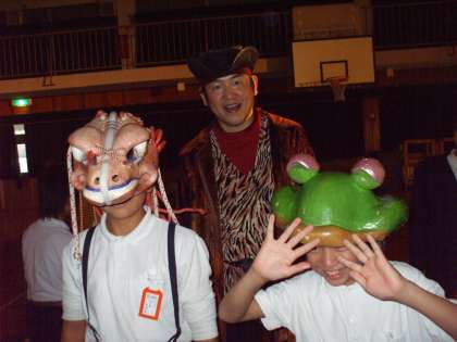 俳優の方とお面をかぶっての記念撮影。卵博士を演じていた俳優の方が、最後に6年生だけですが、今日の劇を見てくれた一人ひとりと目を合わせてから帰りたい。といって時間をとってくださいました。