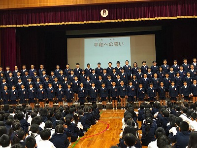 そして、平和への誓いを力強く述べた後、「高殿小学校 平和の歌」を斉唱しました。