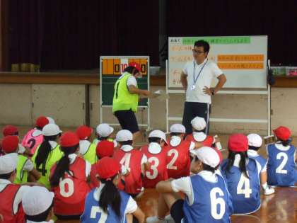 10月28日(火)、6時間目、5年2組において、尾崎先生が公開授業を行いました。「作戦をたて、楽しく練習やゲームをしよう」をめあてとして、バスケットボールをしました。チームで準備体操、練習を行い、授業の後半はゲームをしました。作戦を立てたり、対策を練ったりと、チームで輪になって考えていました。