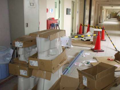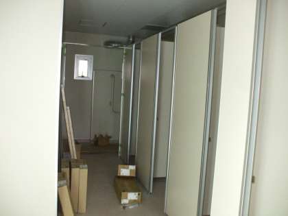 個室の仕切りが設置され、いよいよ便器をはめ込む段階に入りました。だんだんとトイレらしくなってきました。