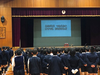 今朝の児童集会では、1月20日に予定されている「見守り隊・青パトへの感謝の集会」で、感謝の気持ちを伝えるための歌の練習をしました。毎日、自分たちの安全を見守っていただいている方々に気持ちが伝わるように全員が声をそろえて歌うようにしました。