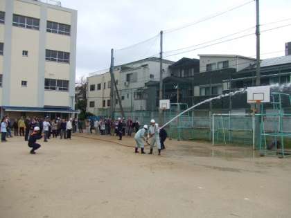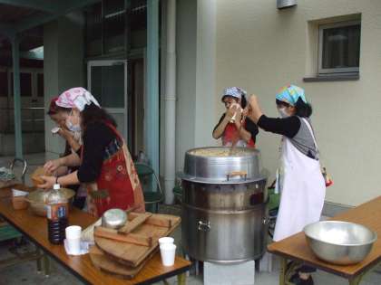 訓練終了後は、調理室で下ごしらえをした豚汁を講堂前で食べました。