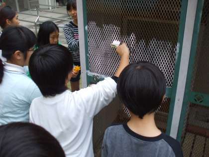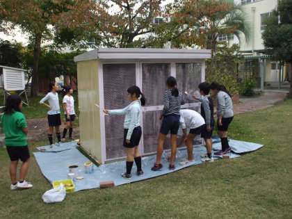 11月6日(木)、6時間目、飼育栽培委員会のメンバーが、中庭のウサギ小屋をきれいにしてくれました。管理作業員さんからアドバイスをもらいながら、クリーム色とピンク色を使い分けて、ローラーとはけで塗ってくれました。中庭がだんだんと美しくなってきました。