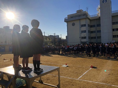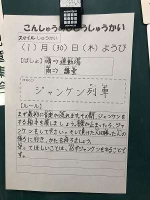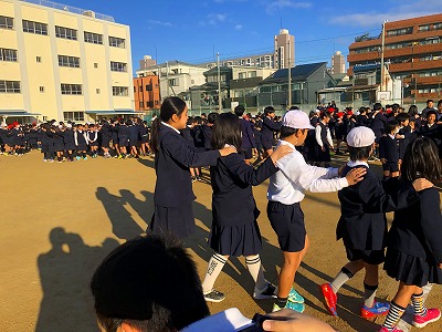 1月30日(木)のスマイル集会は、運動場で「じゃんけん列車」をしました。冬晴れの空の下、運動場には歓声が響き、集会の終わりには長い列車が数本できていました。