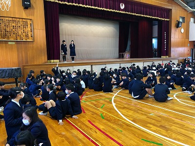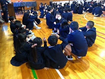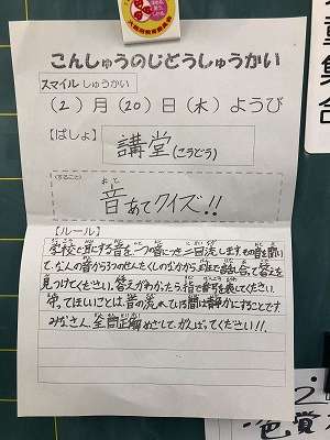 2月20日(木)のスマイル集会は、集会委員会による「音あてクイズ」でした。学校でよく耳にする音を聞いてもらい、それが何の音かを班ごとに話し合い、3択で答えていきます。