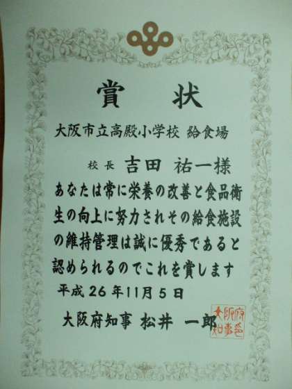 11月5日(水)、エル・おおさか(大阪府立労働センター)において、平成26年度大阪府保健衛生優良施設知事表彰にあたり、本校の調理室が衛生上非常に優れているということで、知事賞をいただきました。