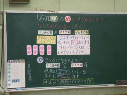 11月17日(月)5時間目、2年2組で算数の公開授業が行われました。単元は「かけ算」でした。授業のめあては、「かけざんのしきになるもんだいを作ろう」でした。