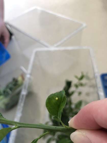 おや、はっぱの上に小さなたまごを見つけました。このたまごは、なにのたまごでしょうか。