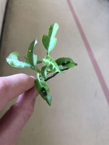 うまれたのは、小さなよう虫です。白と黒のもようが、鳥のふんによくにていますね。はっぱをどんどん食べています。