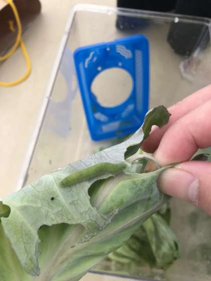 キャベツのはにも、小さなよう虫がいました。みどりっぽい体をしているから、「青虫(アオムシ)」とよばれるのですね。