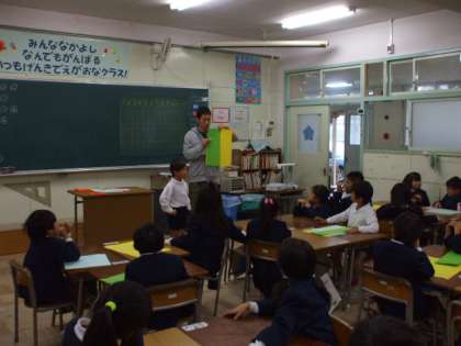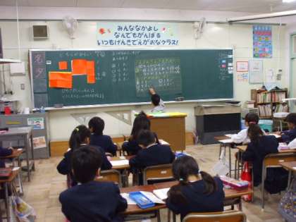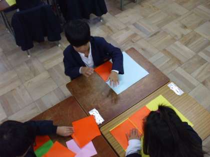 11月25日(火)3時間目、1年3組で経免先生による算数の授業公開が行われました。単元は「どちらが広い」 面積の勉強です。まだ、単位を使った面積の表現方法を学習していない1年生に面積の広さをどうやって比較させるかがテーマでした。班に分かれて、いろいろな方法を話し合っていました。