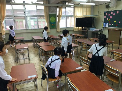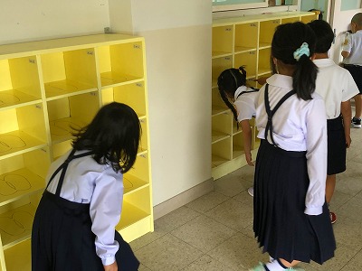 保護者の皆様に、学校生活についての説明をしている間、子どもたちは、自分の教室に行き、靴箱や座席の位置を確認したり、トイレの場所を確認したりしました。