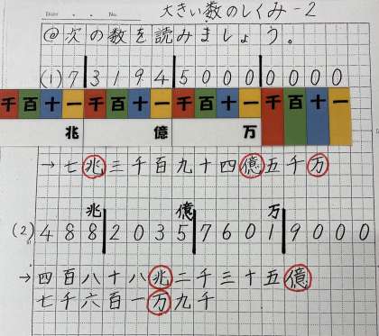 3年生でも位取り表を使って大きな数の学習をしたと思いますが、4年生でも同じように使うことができます。ノートのサイズに合わせて作っているので、むずかしいなと感じたら、ノートの1マスに1つずつ数字を書いてみるとかんたんに問題をとくことができます。なれてきたら、位取り表を使わなくても一の位から4けたごとに区切って、数字を読み、そこに単位をつけて読むと、間ちがいにくくなります。もっとできるぞという人は、「兆」より大きい数が教科書でしょうかいされているのでチャレンジしてみてね。