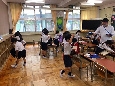 校内では、今日はランドセルから物を出して「朝の用意」を練習したり、座り方、帰りの用意など、基本的な学校生活の仕方を勉強しました。