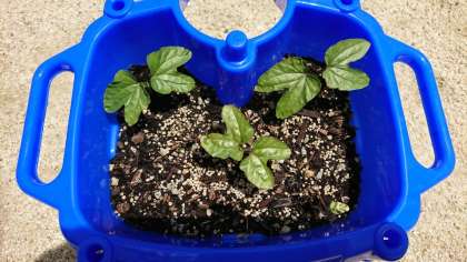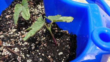 2まいの はっぱを ひろげているね。この 2まいの はっぱのことを、しよう(ふたば)と いいます。なんの かたちに みえるかな。