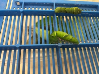 アゲハチョウのよう虫は,皮をぬぐたびに大きくなりました。よう虫は,大きくなるたびに,食べるえさのりょうがふえていきました。大きくなったよう虫は,やがてさなぎになりました。さなぎになる前は,下の写しんのように動かなくなりました。