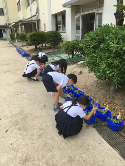 きょうの とうこうびは、あさがおに みずやりをしました。じぶんの うえきばちを さがして、「おおきく なってね。」と、きもちを こめて みずやりを しました。