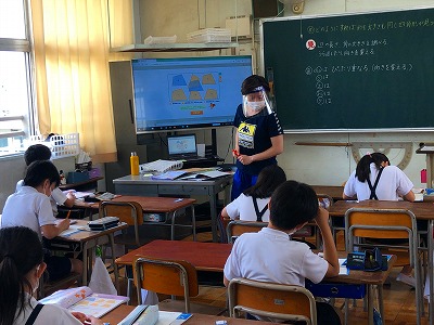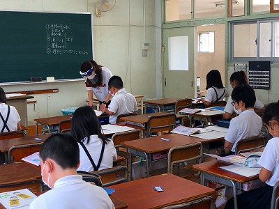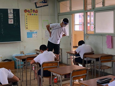 教育委員会より、全教職員にフェースシールドの支給がありました。常時、着用というわけではありませんが、何人かの先生に試着してもらいました。活動内容に応じてつけるように考えています。ただ、私も10分ほど着用して、授業を見て回りましたが、季節柄、マスクとの併用は熱がこもり、熱中症の心配があります。