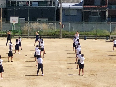 この時間は、5.6年生が、運動場で十分に距離を保ちながら、ラジオ体操や学年で独自に作った体操を行っていました。