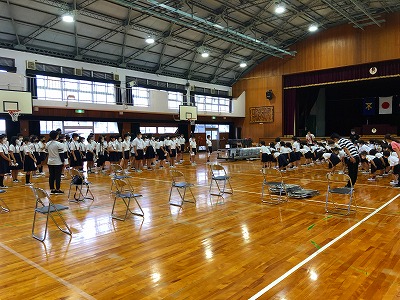 6年生は、最高学年として学校の役に立つ初の出番です。イスの間隔をあけて真っ直ぐ並んでいるか確かめたり、イスの座面をきれいに拭き取ったり、立派に役割を果たしていました。