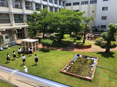6月29日は、朝から晴れわたり、梅雨の合間の晴れ間、いわゆる五月晴れでした。中庭には、休み時間ごとに集まる「中庭ファン」が、芝生の上で遊んだり、池の生き物を興味深げに観察したり、ウサギの「ココア」に草をあげたりしています。