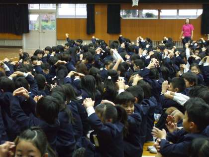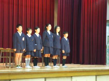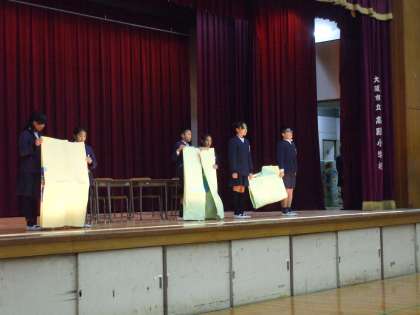 12月11日(木)、児童集会でした。今回は、掲示委員会からの報告です。掲示物作成会議の様子を劇風にまとめてくれました。
