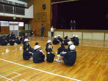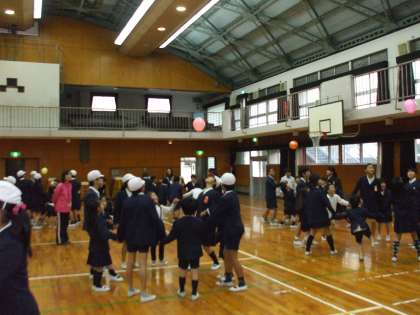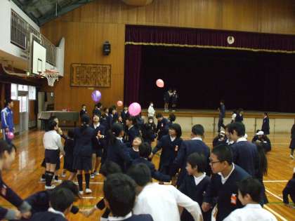 12月11日(木)15分休憩の時間、講堂で全校遊び、今日は6年生と1年生が行いました。6年生が風船を手で触ろうとすると、身長差があるため1年生が万歳するような格好になっていました。6年生もニコニコした表情がいっぱいありました。