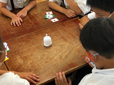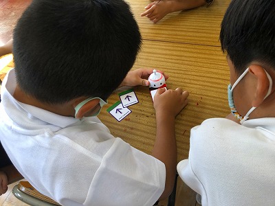 2年生の教室では、新規で導入したプログラミングロボットを使った学習に挑戦しました。このロボットは、端末からの指令も受け取ることができるのですが、低学年の2年生では、指令を書いたカードを、ロボットの口で読み込ませることで、送るようにしていました。