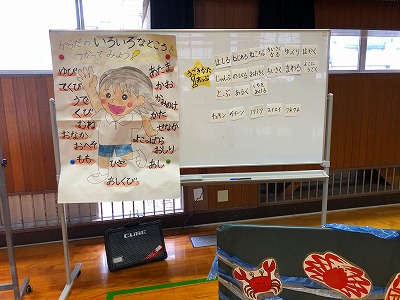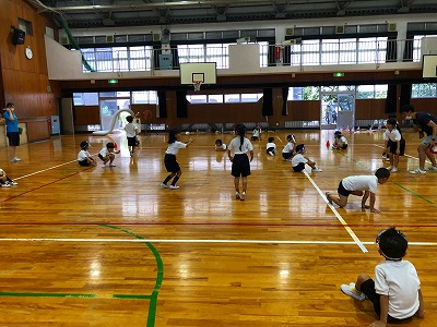 1年生では、海の生き物になりきって様々な動きを工夫していました。動きのイメージが広がるような掲示物や動画視聴などで学びの場を作っていました。